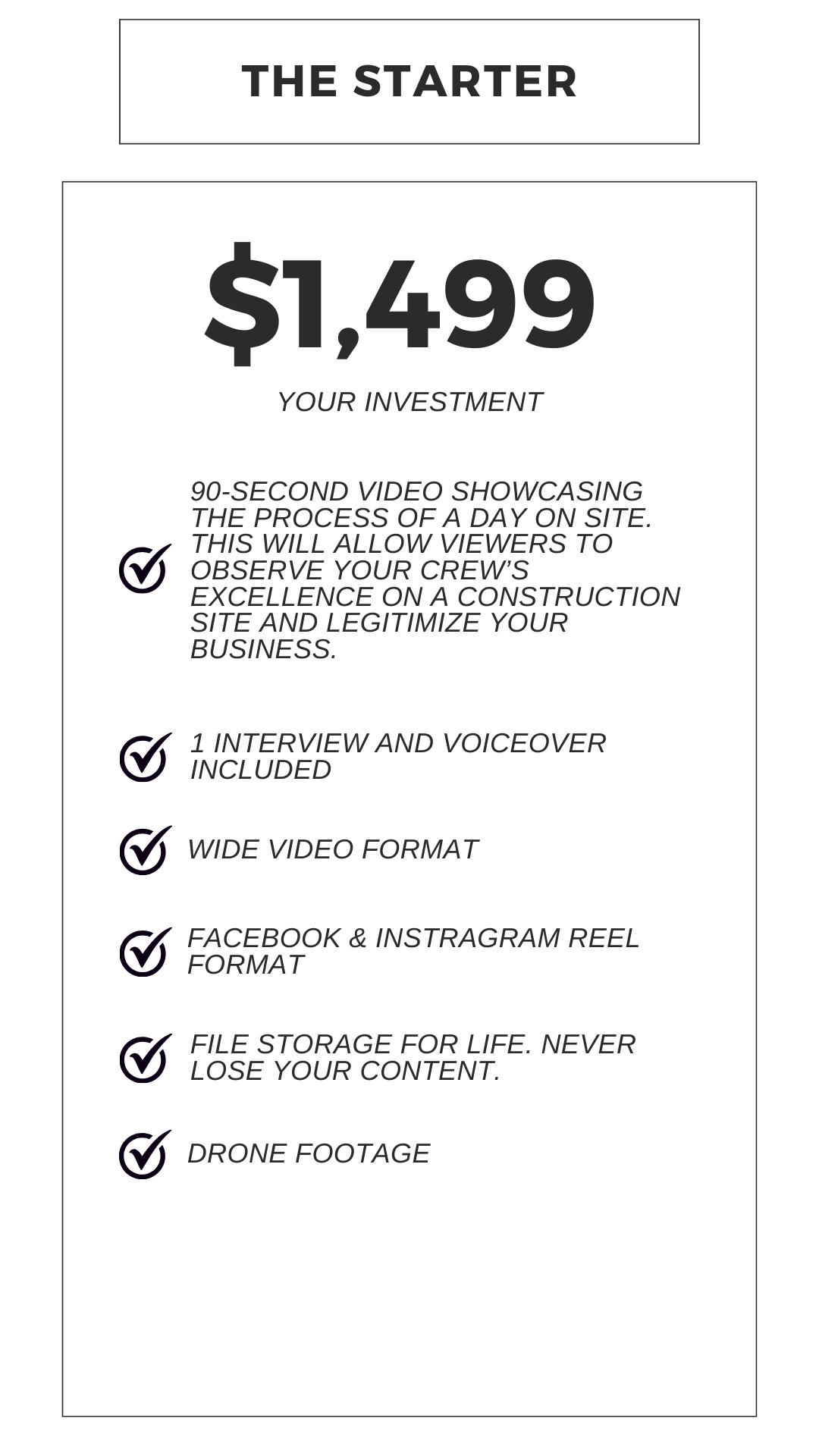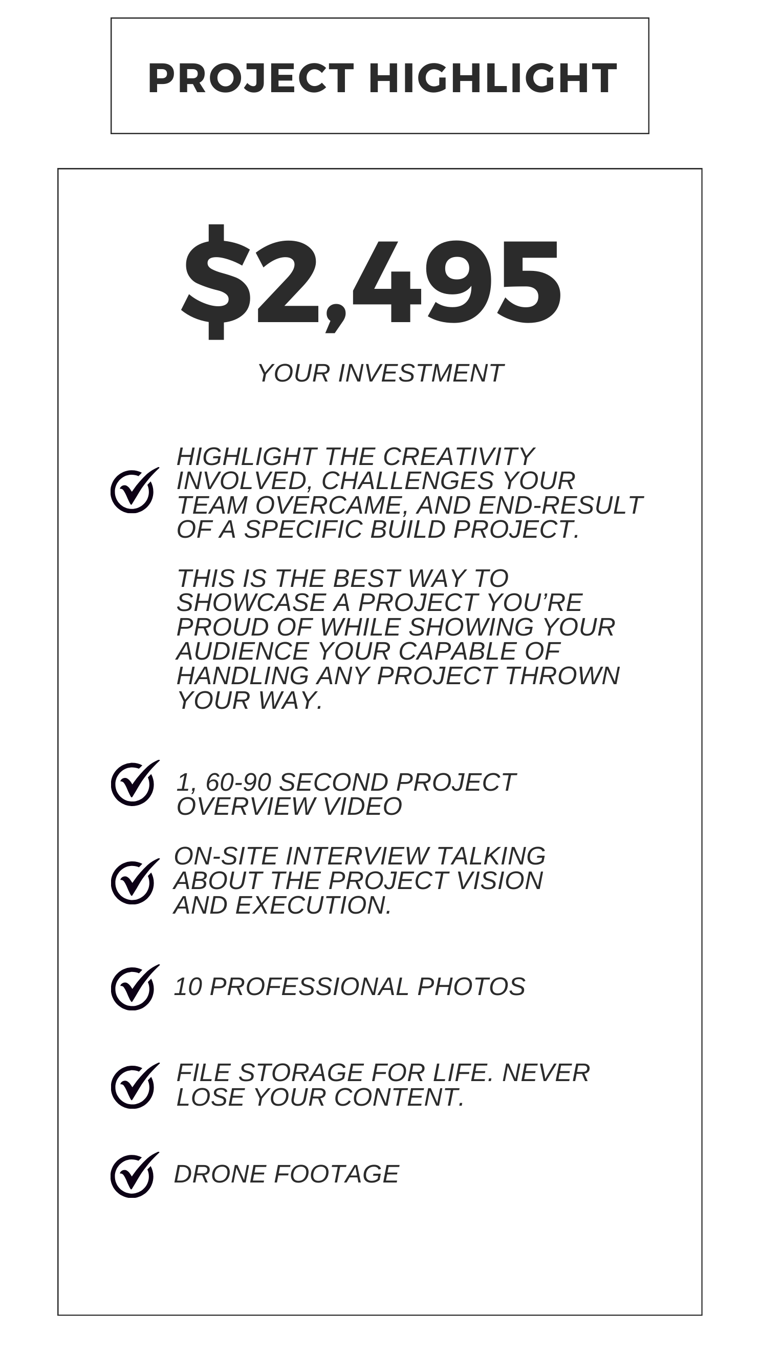 Need a service added onto your package or offered individually? We’ve got your covered. Any type of visual you need to advertise, pitch, or communicate with clients and your team, we can accomplish.